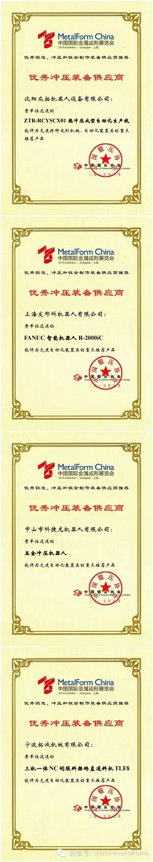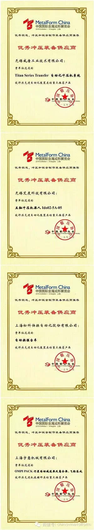 向会员、观众和潜在的购买者推荐优质的装备是中国锻压协会和中国金属成形展览会义不容辞的责任。2014年9月在北京举办的金属成形展上协会启动了这项推荐工作,共推出35家展商的15类共计53个型号的展品,颁发了奖杯,并在展览会前后进行了广泛的宣传,获得了业内的好评。