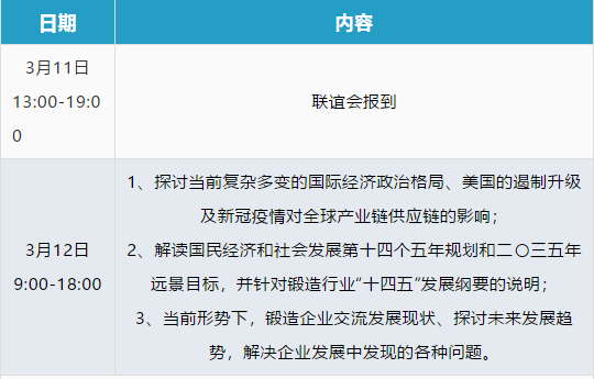 附件1:联谊会基本信息及安排: 一、基本信息: 会议名称:2021江浙沪地区锻造企业领导联谊座谈会 会议时间:2021年3月11-12日 会议地点:无锡(具体地点后续通知) 邀请对象:江浙沪地区锻造企业领导 二、行程安排: