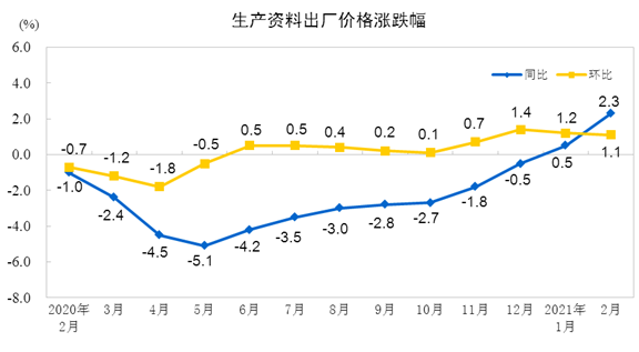 2021年2月份,全国工业生产者出厂价格同比上涨1.7%,环比上涨0.8%;工业生产者购进价格同比上涨2.4%,环比上涨1.2%。1—2月平均,工业生产者出厂价格比去年同期上涨1.0%,工业生产者购进价格上涨1.6%。